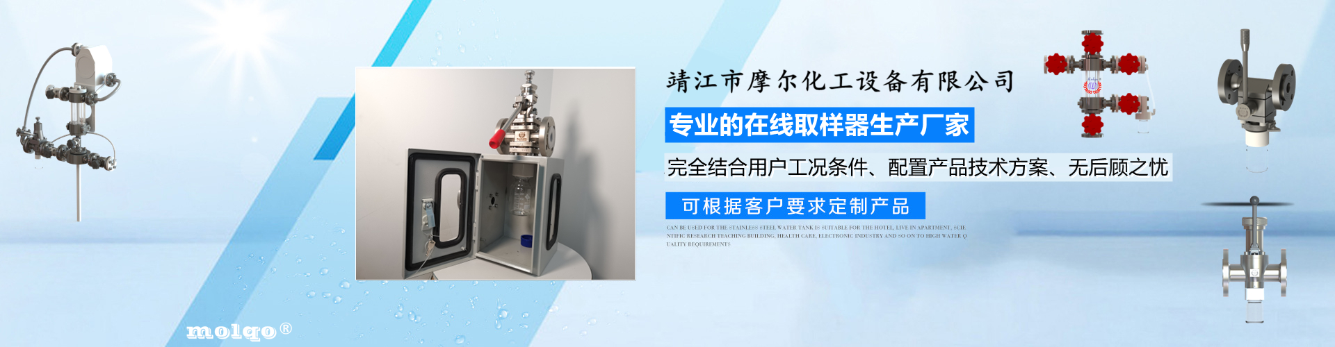 靖江市摩爾化工設(shè)備有限公司位于蘇中明珠——江蘇省靖江市城南工業(yè)園區(qū)東進路北側(cè)天元艾爾瑞內(nèi),另有生產(chǎn)基地位于靖江市經(jīng)濟技術(shù)開發(fā)區(qū)新號路1號鼎電科技園內(nèi)。我公司由數(shù)名長期從事化工生產(chǎn)、氟塑襯里模具開發(fā)以及機械自控設(shè)備的專業(yè)人員共同合作成立,致力于提供客戶最優(yōu)的高效在線取樣、反應及精餾分離設(shè)備,為客戶提供合理的設(shè)備選型方案,以幫助客戶提高綜合生產(chǎn)效率以及改善生產(chǎn)現(xiàn)場環(huán)境為目標。 本公司主要制造及銷售的產(chǎn)品有:釜用在線取樣裝置,管道取樣閥,釜用清洗噴淋裝置、搪玻璃設(shè)備、GMP專用搪玻璃設(shè)備、氟塑襯里設(shè)備、攪拌器、釜用機械密封、氣動閥門及搪玻璃管道、襯氟閥門管道、非標不銹鋼容器,精餾塔塔器、片式冷凝器及PTFE密封件、鋯、鈦、鉭、鎳等加工件制品。我司是一家集研發(fā)銷售、設(shè)計咨詢服務于一體的專業(yè)···